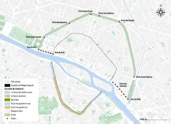 The wall of Charles V, built from 1356 to 1383 is one of the city walls of Paris built on orders granted by Charles V of France. It was built on the right bank of the river Seine outside the wall of Philippe Auguste. In the 1640s, the western part of the wall of Charles V was demolished and replaced by the larger Louis XIII wall, with the demolished material reused for the new wall. This new enclosure (enceinte) was completely destroyed in the 1670s and was replaced by the Grands Boulevards.