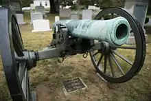 His grave marker is one of the most idiosyncratic in Arlington National Cemetery. His resting place, including that of his wife and two daughters, is marked by a twelve-hundred-pound Napoleon cannon.[34] The brass fieldpiece, cast in 1862 and believed to have been used in combat during the American Civil War, was placed shortly after his funeral.[35]