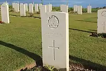 He was killed in action on 1 May 1918 in the Second Battle of Villers-Bretonneux. A shell burst at his company headquarters sending a splinter through his head as the officers were sitting down to tea.[6] He is buried in the Villers-Bretonneux Military Cemetery.[1][10]