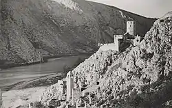 The earliest mention of or recorded reference to Počitelj is in charters of king Alfonso V and Fridrich III from 1444 to 1448. However, the village most likely predates these documents. The exact date can't be pinpointed but it is likely that fortified town along with its complementary settlements was built by Bosnian king Tvrtko I sometime in 1383.[1][3][4] Počitelj was considered the administrative center and center of governance of Župa Dubrava (county), while its westernmost point gave it major strategic importance. The fortress and its podgrađe during this time was under control of Kosača noble family, whose chiftain Stjepan Vukčić and his hair Vlatko Hercegović During the years following Ottoman conquest of Bosnian realm, between 1464 and 1471, the town was fortified by Vladislav Herzegović with a support of Dubrovnik, king Matthias Corvinus of Hungary and the Pope. From this point the walled town of Počitelj evolved in the period from the 16th to the 18th centuries. Architecturally, the stone-constructed parts of the town are a fortified complex, in which two stages of evolution are evident: medieval, and Ottoman.[1][3][2]