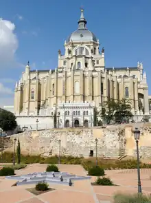 Ruins of the walls still stand along the Calle Mayor street, at number 83, next to the viaduct that serves the Calle de Segovia, along with the ruins of the Tower of Narigües, which probably would have been an albarrana tower.[7] A 70 m (230 ft) long section exists under the Plaza de la Armería, formed by the main façades of the Royal Palace and Almudena Cathedral.[8]