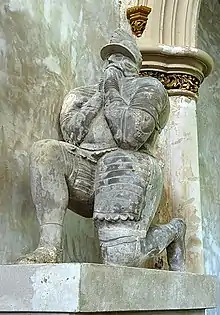 - Thomas Erle (d.1597), eldest son,[14] whose large effigy dressed in full-armour and kneeling on one knee in prayer, survives (re-positioned) in St Mary's Church, Morden, Dorset, the parish church of Charborough House. In 1581 at Shute in Devon, he married Dorothy Pole, a daughter of his father's near neighbour William Pole (1515–1587), Esquire, MP, of Shute House in the parish of Shute, near Colyton, Devon. Dorothy's brother was the Devon antiquary and historian Sir William Pole (1561–1635) whose principal seat was Colcombe House in the parish of Colyton, the former residence of Walter Erle of which mansion house and deerpark a lease had been granted to him by the Queen Catherine Parr. Pole describes various of the Erle family's landholdings in his work Collections Towards a Description of the County of Devon.[26] Dorothy's mother was Katherine Popham (died 1588), the sister of John Popham (1531–1607), Lord Chief Justice. Dorothy survived her husband and remarried to Sir Walter Vaughan (c.1572-1639), of Falstone (alias Fallersdon) in the parish of Bishopstone, Wiltshire, Sheriff of Wiltshire in 1599-1600 and a Member of Parliament for Wiltshire in 1606.[27] Thomas Erle commenced building a pier at Axmouth,[28] which manor had been acquired by his father. By his wife he had children including: