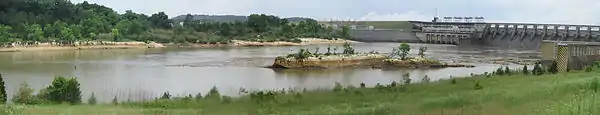 The Walter F. George Lake, named for Walter F. George (1878–1957), a United States senator from Georgia, is formed on the Chattahoochee River along the state line between Alabama and Georgia. It is also widely known by the name, Lake Eufaula – particularly in Alabama, where the state legislature passed a resolution on June 25, 1963, to give the lake that name.[1] The 46,000 acres (190 km2) lake extends north about 85 miles (140 km) from the Walter F. George Lock and Dam (31°37′10″N 85°4′15″W / 31.61944°N 85.07083°W) and has approximately 640 miles (1,030 km) of shoreline. Popular activities along the lake include camping and trophy fishing.