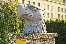 Perhaps Lemcke's most significant eagle statue was the one that once stood on the roof of the Berlin Tempelhof Airport. Designed by Ernst Sagebiel and implemented by Lemcke, it stood at 4.5 m and was visible for many miles. Rather than holding a swastika in its claws, this sculpture grasped a large globe to symbolise the international aspect of the airport. The sculpture was cast in iron before being treated to appear bronze. In 1962 the statue was removed to make way for the installation of new radar equipment.[3] The airport was closed in 2008[4] and the head is now located near to the entrance of the nearby Platz der Luftbrücke.[3] This led to the area being named "Eagle Square".[5]
