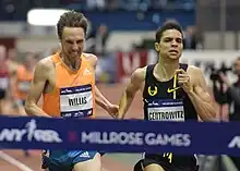 ![]() Matt Centrowitz and Nick Willis racing for first place in the 2015 Wanamaker Mile. Centrowitz ends up beating Willis by 0.11 seconds, in a time of 3:51.35.[1] | |