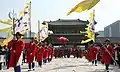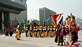 The guards wore royal uniforms, carried traditional weapons, and played traditional instruments.[3] The Sumunjang and Sujongjang wore and plate and mail armor (gyeongbeongap, Korean: 경번갑; Hanja: 鏡幡甲) and the Gapsa wore dudumiggap (Korean: 두두미갑; Hanja: 頭頭味甲), a ceremonial armor that does not provide protection in battle.[4]