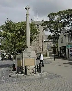 Erected in 1921, the Poulton-le-Fylde War Memorial is located in the English market town of Poulton-le-Fylde, Lancashire. A Grade II listed structure, it stands in a small cobbled area at the north end of Market Place, having been moved from nearby Queen’s Square in 1979.[1] Made of granite, it consists of a pillar with an octagonal foot, and a ball finial surmounted by a wheel-head cross. The pillar is on a square plinth on an octagonal step. On the plinth is a timber plaque with a coat of arms, a bronze plaque with an inscription, and further plaques recording the names of those lost in the World Wars and another conflict.[2]