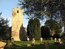 The church at Warden is dedicated to St Michael, and has an Anglo Saxon tower dating back to the eleventh century, and built of Roman stone. Indications are that there was a church earlier than the tower, and in the post Conquest period, another church was added to the tower. The tower arch is built of Roman material, probably from Chesters Roman Fort. Transepts were added in the thirteenth century making the church cruciform in shape. There were alterations in the eighteenth century, and the chancel was rebuilt in 1889. In the chancel is a Norman grave-cover that is the best of its kind in the county. Its shape and tile decoration symbolise a house of the dead.[2][4] There are a number of incised grave covers in the porch, and a Roman altar that has been carved with Saxon knot-work. It has been split and reversed, possibly "to empty out the devils." An 18th century horsing-stool stands at the church-gate.[2] [4] Three of the bells in the church were cast in 1878 by the Newcastle firm of Cox and Sons.[5]