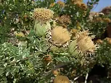 The erect flowerheads stand individually at the tip of the stems or with two or three together. Each is 3–4 cm long, 4½–6 cm wide, and contains disk florets only. The common base of the florets (or receptacle) is flat with indents where the florets are inplanted, while scales and hairs are absent. The bell-shaped involucre consists of four to five rows of green bracts, sometimes tinged purple at the stretched tip and with a papery irregularly fine dentate edge. The bracts in the outer row are 6–7 mm long and 1½–2 mm wide, while bracts in rows further up are increasingly long, eventually reaching 21–23 mm. Each head carries twenty five to forty florets.[1]