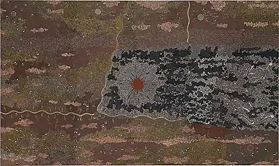 Contemporary Indigenous Australian art originated with the Indigenous men of Papunya, located around 240 kilometres (150 mi) northwest of Alice Springs in Australia's Western Desert, who began painting in 1971.[4] The youngest was Clifford Possum Tjapaltjarri, encouraged by his older brother Tim Leura Tjapaltjarri.[5] A number of the men developed a distinctive style of narrative painting that, beginning around 1976, resulted in the production of several "monumental" works that included representations of both their traditional lands and of ceremonial iconography.[6][7] Clifford Possum was the first to make this transition commencing with a related painting, also titled Warlugulong (1976), now held by the Art Gallery of New South Wales.[8] The two images are amongst five that the artist created between 1976 and 1979 that linked the iconography of sacred stories to geographic representation of his country – the land to which he belonged and about which he had traditional knowledge.[9][10] The artist's images of this period are visually complex, and contain a wide variety of patterns, unified by strong background motifs and structure.[11]