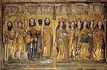 The Gothic carved altar from around 1475 – rumours say it was taken from a shipwreck – is the work of an unknown master from Gdańsk. It was restored in 2010. In the central shrine the figures are next to and behind each other in an odd way, without being connected by a common theme as was usual at that time. A pillar in the middle divides them into two groups. In the front row on the left the Saviour blessing, St. George, St. Nicholas (probably) and John the Baptist can be seen. Behind it Saint Maurice as a Moor, St. Gregory as pope and a bishop (perhaps the St. Erasmus). In the front row on the right there are Mary, the mother of Jesus, Mary Magdalene with ointment jar (or is it the St. Barbara with her tower ?), St. Catherine with the wheel and sword and St. Dorothea with roses and the cup. Behind them are seen three crowned female saints, of which only the St. Agnes with the lamb can be determined. In the right wing one can see five Acts: of which Paul and James the Elder are pilgrims, Judas Thaddeus with club and two female saints, including St. Elizabeth recognizable on the pitcher and the plate. Below is a deacon, probably the St. Lawrence. In the left wing are the other seven apostles and St. Stephen with three stones in the arm. Of the apostles only the four top can be determined: Peter, Andrew, John and Bartholomew. On the predella above the table are in the middle: Christ crowned with thorns, right the St. Elizabeth and Mary Magdalene, left St. Agnes and St. Barbara with a chalice. The crucifix in front of the altarpiece is the oldest art work in the church. It was created in the first third of the 15th century and was already in the same spot in the old fishermen's church.