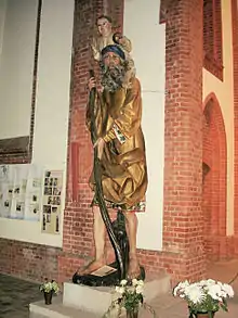 From around the same time as the altar is the statue of Saint Christopher (Greek: christos pherein, "Christ bearer") with the Christ child on his shoulder. This portrait was traditionally adored with special affection by the Warnemünder: This saint found his life's mission in helping people overcoming waters, an activity that was also a business of the local fishermen. The figure is made of oak and is 3.72 meters high. In the old church it had its place on the northern wall of the choir, under the Arc de Triomphe. In 2007 the statue was restored. The name of this saint is often seen in public life: For example, the rescue helicopters in Germany, have the radio call Christopher. The Warnemünde church mouse is named Christopher and knows as a "mouse" how to teach the children pieces of information in the community newsletter.