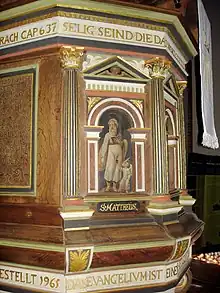 The renaissance pulpit was built in 1591 by local wood carver Hans Wegner. After the demolition of the old church in 1872 the pulpit was given to the Rostock Museum, restored and completed in 1965, and replaced in the church.