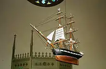 Visitors to the church of Warnemünde are struck by two items that are not found in many churches. In the aisles are seen two votive ships that the parish was given by the Warnemünde harbor pilots David and Jantzen. Votive ships can be found in some churches of northern German towns (also in Ahrenshoop, Dierhagen, Wismar and Wolgast); they are a votive offering often given to churches in gratitude for the preservation and protection on the high seas. In the south part of the transept hangs the barque "Marie" built in 1887 by Captain Henry Stuhr and in the north part the "Schnau", a brig from the 18th century, which was made in 1825 by maritime pilot Jungmann. On the sail of the "Schnau" is the inscription "Now I have found the seabed where my anchor holds forever." This known Choralvers was written in 1726 by the Moravian pastor Johann Andreas Rothe. The song refers to a ground which is fixed and unchangeable, which is also true when "earth and heaven goes down.": "Who has founded on him, anchored on a solid foundation of strength that is independent of the changes in history and the lives of people. This stable, steady basis is the divine gospel of our Lord Jesus Christ. Who uses it has, in quiet and stormy days, at home and on rough Sea a foothold, that man in life and death can trust."