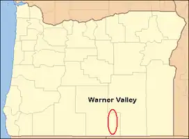 The Warner Valley is located in south-central Oregon. It is approximately 60 miles (97 km) long and 8 miles (13 km) wide. Most of the valley is in Lake County; however, the north end of the valley extends about 10 miles (16 km) into Harney County. The valley has two regions commonly referred to as the South Warner Valley and the North Warner Valley. The two areas transition between Crump Lake and Hart Lake at a point where the valley narrows to about 5 miles (8.0 km) in width.[1]