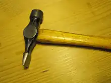 The Warrington hammer is a common woodworking tool that falls under the cross-peen category of hammers. The chisel-like cross-peen side of the hammer is used to set small nails and pins while the smaller, rounded face is used to finish driving in the aforementioned nail. The cross-peen side of the tool is also used for refining work, such as furniture and cabinet making. While the standard claw hammer would be more used for tasks that involve greater use of force, the Warrington hammer is preferred for projects that require precision, hence its prevalence in the art of woodworking. The most common length of a standard Warrington hammer is around 12+1⁄2 inches (320 mm) in length with the hammer head weighing between 10 and 14 ounces (280 and 400 g).[1][2]