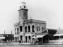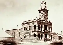 A clock tower was not part of Powell's original design for the new Town Hall. In late 1887 however, it had been suggested that the building would be enhanced by the addition of a clock tower. At a meeting of ratepayers in December 1887, a vote was carried in favour of the addition of a tower which was subsequently incorporated into the building. The clock itself was not installed until c. 1892. As part of the striking apparatus, it is understood that the Council acquired a bell from St Mary's Church in Warwick which was eventually installed on the outside of the tower.[1]