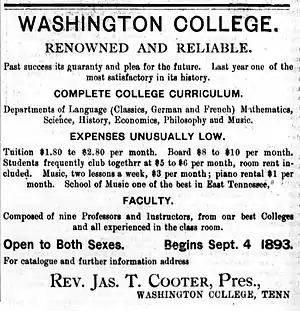 By the 1880s, Washington College was again prospering under the presidency of J.W.C. Willoughby, reporting an enrollment of 148 in 1884. It began awarding Bachelor of Science, Bachelor of Arts, and Bachelor of Instruction degrees during this period. The YMCA and YWCA established organizations on campus, and a school newspaper, the Progressive Educator (later known as the Pioneer Educator) was launched in 1886. The 32-year presidency of James T. Cooter, which began in 1891, saw the school transition to a junior college. An industrial department was established, and a 135-acre (55 ha) farm was purchased in 1900. The school was one of the first in the area to obtain a telephone connection and electricity.[3]