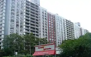 Washington Square Village was proposed in July 1957 as part of a six-building, 2,004 unit complex that would stretch down to Houston Street; 54,000 square feet (5,000 m2) of shopping space was to be included.[5] In the 1950s, after the assembly of the superblock, Washington Square Village was constructed as a for-profit, middle class housing complex. It was marketed to people who might otherwise move out of the city or who had already moved out to the suburbs and might want to move back. Initially, the apartment complex was referred to as Tishman’s Tenements, after Paul Tishman one of the original developers.[6] Rents for studios to three bedrooms ranged from about $150 to about $300 per month with about $25 extra for underground parking. Occupancy commenced in the Fall of 1958 with the opening of the north Buildings 1 and 2. South buildings 3 and 4 were opened a year or two later with freight elevators and no penthouses. A third building was to be built in the block where the University Plaza and the Silver Towers now stand. This was never accomplished presumably for lack of demand or due to the increased cost and taxes.