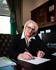 Troy Kelley,[14] the 10th State Auditor, was inaugurated in January 2013 and completed his term in office in January 2017. For nine months during his term, he took a leave of absence and was replaced by Acting State Auditor Jan Jutte after his indictment by the United States Department of Justice for mortgage fraud in 2015.[15] The mission of the office is to hold state and local governments accountable for the use of public funds.[14]