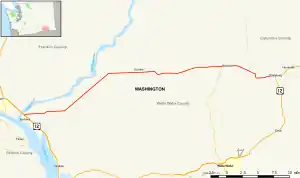 State Route 124 (SR 124) is a state highway in Walla Walla County, Washington, United States. It spans 45 miles (72 km) from Burbank in the west to Waitsburg in the east, intersecting U.S. Route 12 (US 12) at both ends. The highway generally follows the Snake and Touchet rivers and intersects SR 125 near Prescott.