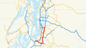 The corridor was proposed as an addition to Washington's state highway system as early as 1909 and was ultimately added in 1913 as part of the Pacific Highway, although most of this was then deleted in 1923.[23][24][25] The only portion kept was that between Auburn and Renton, which became part of State Road 5. The rest of the route (between Auburn and Tacoma) was added back to the state highway system two years later in 1925, also as a part of State Road 5.[26] This route was extended north along Rainier Avenue into Seattle in 1937.[27]