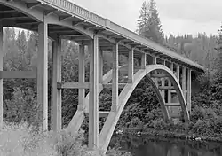 US 10 was replaced by the western extension of US 2 in 1946.[17][18] Three years later, in 1949, the Spokane River Bridge at Long Lake Dam was constructed and spanned from the southern terminus of SSH 3J to Lincoln County.[19][20][21] In 1957, PSH 3 and US 395 were moved to an eastern route bypassing Springdale, while SSH 3J was extended north towards Chewelah and a branch of the highway was added to Loon Lake, both along the former route of PSH 3.[22][23] SSH 3J was extended south to PSH 2 and US 2 in Reardan, east of the northern terminus of SSH 2G, in 1963.[24] During the 1964 highway renumbering, SR 231 was created from SSH 2G and SSH 3J and became concurrent with US 2; US 2 replaced PSH 2 and US 395 replaced PSH 3, while the branch of SSH 3J to Loon Lake became SR 292.[2][25][26] The Spokane River Bridge was added to the National Register of Historic Places on June 2, 1995 along with the rest of the bridges on the Spokane River northwest of Spokane, and the bridge was repaired in late 2008.[20][27][28] In the 1990s, the state proposed a jurisdictional transfer with Lincoln County to decommission the Sprague–Reardan section of SR 231.[29] The highway was later used to haul uranium waste by truck following attempts by WSDOT to force the contractor to fund safety improvements on its haul route.[30]
