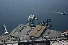 SR 519 was codified in 1991 as a state highway and began at the western terminus of I-90, then at 4th Avenue S., and traveled west onto Royal Brougham Way and north on Alaskan Way to Colman Dock.[2] The city streets in Seattle used by SR 519 were constructed after the series of regrades in the early 20th century filled a mudflat in SoDo.[11] By 1916, Alaskan Way (then known as Railroad Avenue) was paved and had its rails removed to handle growing traffic.[12][13] The Alaskan Way Viaduct was built above Alaskan Way between 1950 and 1953 and narrowed the street after Colman Dock was transferred to Washington State Ferries in 1951.[14][15] Ferry routes were incorporated into the state highway system in 1994, as SR 304 and SR 305 were extended to Seattle and SR 339 was created.[16]