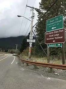 State Route 906 Spur (SR 906 Spur) is a 0.43-mile-long (690 m) spur route located entirely within the unincorporated community of Hyak, Kittitas County. It branches from its parent just before SR 906's eastern terminus at I-90.[1] The highway travels southeast, between I-90 and the Iron Horse Trail, and ends at a WSDOT maintenance facility located at the north end of Keechelus Lake. The old Chicago, Milwaukee, St. Paul & Pacific Railroad-Hyak Depot is accessible from SR 906 Spur, which now acts as a trail head for the Iron Horse rail trail.[18] WSDOT conducts a series of surveys to measure traffic volume in terms of AADT and calculated that 300 vehicles-per-day used the spur route in 2012. This number has remained steady between 2009 and 2012.[9]