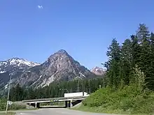 Automobile roads over Snoqualmie Pass date back to 1905, when the first car traveled over the pass. A one-lane road was competed by 1909 to promote the Alaska–Yukon–Pacific Exposition in Seattle, complete with a race over the pass. The Sunset Highway was built as a two-lane road in 1915, and rebuilt along the abandoned right-of-way of the Chicago, Milwaukee, St. Paul and Pacific Railroad in 1926.[10] The Sunset Highway was a part of the Yellowstone Trail, a transcontinental auto-trail.[11] In 1926 the United States Numbered Highway System was established, and the highway over Snoqualmie Pass was designated U.S. Route 10 (US 10).[12] The bridge that carries SR 906 over Hyak Creek was built in 1928.[13] The road was first able to be kept open all winter by 1931, and in 1934 it was numbered Primary State Highway 2 in addition to US 10.[10] The highway was paved between 1931 and 1939.[14][15]