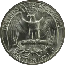 The original Washington quarter design struck until 1998 depicted a head of George Washington facing left, with "Liberty" above the head, the date below, and "In God We Trust" in the left field. The reverse depicted an eagle with wings outspread perches on a bundle of arrows framed below by two olive branches.[1]