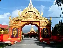 The temple is renowned for a century-old Buddha statue nicknamed the "Lifting Buddha".[2] Urban legend has it that the statue contains the ability to predict whether a devotee's wishes can be fulfilled. If the statue can be lifted the first time the devotee concentrates on his or her wishes, and subsequently becomes too heavy to lift the second time, then the devotee's wish is indeed attainable.[2] Although founded as a Theravāda Buddhist temple with the layout of Thai tradition, the temple are decorated with various mythical religious creatures of Nāgas with the mixture of Hindu and Taoist deities such as the statue of Ganesha which is placed at the main entrance while in the left located a shrine specifically for Guan Yin.[1] On the far side leading to the burial grounds, there is a small shrine to Tudigong (Goddess of Land). In spite of the temple complex modest size, it has arguably one of the largest arches in the state.[1]