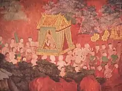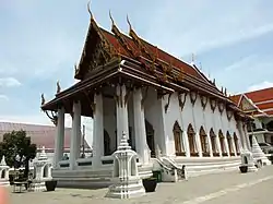 King Nangklao (Rama III), restored the temple and sponsored the painting of murals in the ordination hall by two famous artists named Luang Wichijesda or Kru Thong Yu and Chinese Luang Seniborirak or Kru Kong Pae. They competed with each other during the painting using a veil so their unfinished artwork could not be seen.[1] The murals are painted in traditional Thai-style depicting stories of Prince Nemi and Prince Mahosadha from the Mahanipata Jataka. The murals of this temple are considered masterpiece paintings of the Rattanakosin era with 80 percent preserved.[2][3] The architecture of the ordination hall is also of interest, the building being curved like a Chinese junk in the style of late Ayutthaya period.
