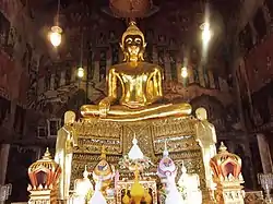The temple's principal Buddha image known as "Phra Satsada" (พระศาสดา; "prophet Buddha") is believed to be a very sacred Buddha image. There are many people who come to make vows each day. To make vows people bring a loincloth to tie around the waist and run around the ordination hall three times along with making the sound like a horse; this is called "running the horse".[1]