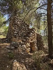 The structures usually had two storeys, with a thick-walled lower floor made of untreated stone for storage of the harvest, and an upper floor that functioned as a watchtower.[2] The temperature inside the structure was relatively cool due to the thick wall of the lower floor, allowing the storage of crops such as grapes, which would otherwise start to ferment. During the harvest period, farmworkers or entire families could live in the watchtower rather than return to their home each day.[3]