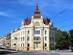 Alongside the Marschall Palace, the Water Palace marks the access to the Iosefin district, crossing the Trajan Bridge from the Cetate.[2] The palace was built for the Timiș–Bega Hydro-improvement Company,[1] established in 1871 especially for the management of the Bega Canal, an important transport route at the time. Designed by the architect Lipót Baumhorn, work began in 1900, under the direction of Karl Hart, and was completed a year later, in 1901.[2] The palace was originally a one-storey building, but in 1910 builder Arthur Tunner extended it by adding a second storey, retaining the overall appearance.[3] All sectors of the company functioned in the building, and on the second floor were the studios for employees coming from outside Timișoara.[4]