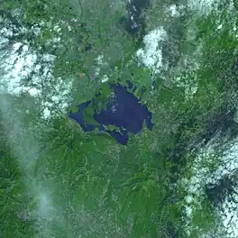 El Salvador counts nearly 360 rivers that connect to form ten hydrographic regions. There are four primary lakes in El Salvador including the Ilopango (72 km2), Guija (44 km2), Coatepeque (24.8 km2), , Olomega ( 24.2 km2) and four reservoirs created by hydroelectric dams discussed in more detail below. El Salvador also obtains about 7.5 km3 of surface water per year from neighboring Honduras and Guatemala.[8] The Cerrón Grande Reservoir, known locally as Lake Suchitlán, is the largest body of fresh water in El Salvador.[9]