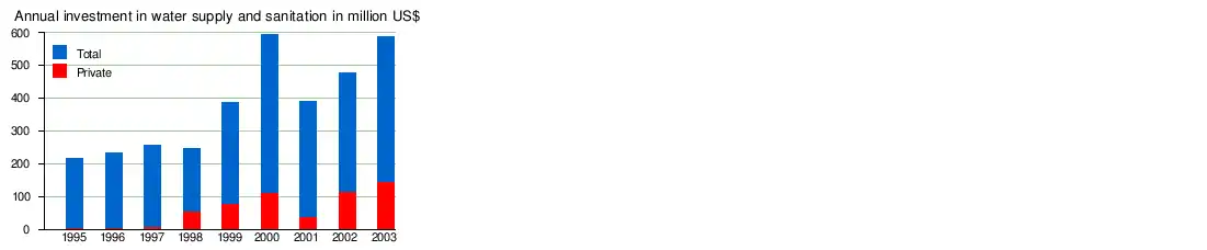 The World Bank's Private Participation in Infrastructure Database shows private investment commitments in water supply and sanitation of US$940 million from 1995 to 2006 through 51 transactions, including 27 classified as concessions, 22 as management and lease contracts, and 2 as greenfield projects.[34]