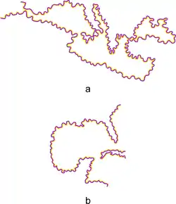 Figure 2. Figure 1 from Pinna (2008).[2] Purple undulated contours adjacent to orange ones are perceived as a map of the Mediterranean Sea (picture a) and the Gulf of Mexico (picture b) evenly colored by a light veil of orange tint spreading from the orange contours (coloration effect). The two shapes show a strong figure-ground segregation and a solid figural appearance comparable to a bas-relief illuminated from the top and to rounded surfaces segregated in depth and extending out from the flat surface (figural effect). On the contrary, the complementary regions appear as empty spaces with the appearance of holes.