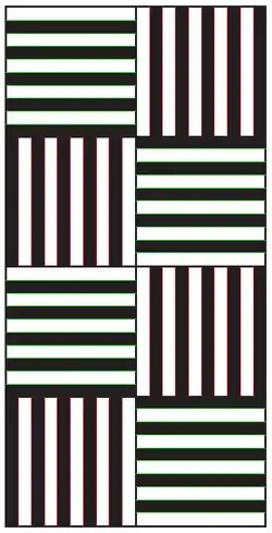 Figure 1. A figure similar to that of Figure 1 of Broerse, Vladusich, and O’Shea (1999),[1] demonstrating what became known as the watercolor illusion. The vertical gratings are black and white with a thin line of red along each black bar. The horizontal gratings are black and white with a thin line of green along each black bar. The illusion is that the red and green appear to spread over the black and white regions of the vertical and horizontal gratings respectively.