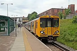 A Merseyrail Class 508 approaches the station, from Liverpool.