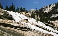 Waterwheel Falls is a waterfall in the Sierra Nevada of California, located in Yosemite National Park. It is the largest of the many waterfalls of the Tuolumne River. Its upper part contains a series of small ledges, each of which creates a small plume as the water is deflected away from the rock face. A regular phenomenon appears at the first and largest of these ledges during the high-water season of early summer. Strong gusts of wind can lift part of the spray and blow it back upward, causing it to reenter the falls above the ledge.[1] This cyclic "waterwheel" gives the falls their name.