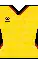 Two men wearing yellow shirts, red shorts and red socks, standing on a grass field. Both appear to be celebrating: one man has his arms aloft, the other is following him.