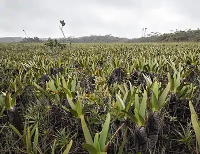 In the central part of the mesa there are scattered occurrences of tepui scrub forests with Bonnetia sessilis and occasional transitions into peat wetlands dominated by Stegolepis ptaritepuiensis. The peat wetlands host other species like Orectanthe sceptrum or Drosera roraimae, making Waukauyengtipu one of just few locations in Guyana where such plants can be observed.[1]
