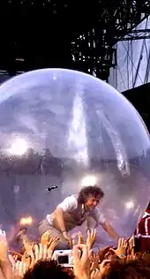 Flaming Lips concerts also feature confetti cannons, lasers, laser pointers, images projected on to a screen, dozens of large balloons, a stage filled with dancers dressed as aliens, yetis, the gloves etc.[10] Before performing, Coyne can be seen helping the stage crew. Their performances have been likened to psychedelic experiences rather than simply music shows, a tradition that goes back to the band's formation.[3]