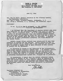 With Ernest Besig of the Northern California ACLU, Collins led Fred Korematsu's constitutional challenge to the Internment of Japanese Americans beginning in 1942, and culminating in his defense of Korematsu (alongside the ACLU's Charles Horskey) before the U.S. Supreme Court in 1944.[9] In a 6–3 decision, the U.S. Supreme Court upheld Korematsu's conviction in Korematsu v. United States in December of that year.[10] Nearly four decades later, in November 1983, the U.S. District Court in San Francisco formally granted the writ of coram nobis and vacated the conviction.[11]