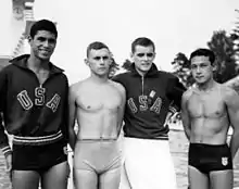 ![]() Gold medal winning U.S. team of 4 × 200 meters free relay in Helsinki 1952: William Woolsey (at left), Wayne Moore, James McLane and Ford Konno. | ||||||||||||||||||||||||
