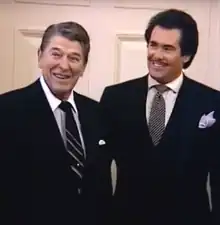 From 1980 through 1982, The Beach Boys and The Grass Roots performed Independence Day concerts on the National Mall in Washington, D.C., attracting large crowds.[21][22] However, in April 1983, James G. Watt, President Reagan's Secretary of the Interior, banned Independence Day concerts on the Mall by such groups. Watt said that "rock bands" that had performed on the Mall on Independence Day in 1981 and 1982 had encouraged drug use and alcoholism and had attracted "the wrong element" who would threaten individuals and families attending any similar events in the future.[22] Watt then announced that Newton, a friend and supporter of President Reagan, would perform at the Mall's 1983 Independence Day celebration.[22][23] Newton entered the Independence Day stage on the Mall on July 4, 1983, to mostly cheering members of the audience, but some members booed.[24][25][26]