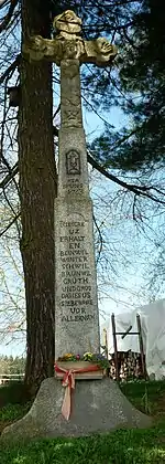A wayside cross is a cross by a footpath, track or road, at an intersection, along the edge of a field or in a forest. It can be made of wood, stone or metal. Stone crosses may also be conciliation crosses. Often they serve as waymarks for walkers and pilgrims or designate dangerous places.[1]