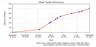 "Weak" was AJR's second song to reach the Billboard Hot 100, preceded by "I'm Ready".[3] Charting in 17 countries, the band has attributed the song's global success to Spotify's algorithms.[17] The song's growth was a "very, very slow process", with the band recounting its streaming count updating by thousands per day initially.[18]